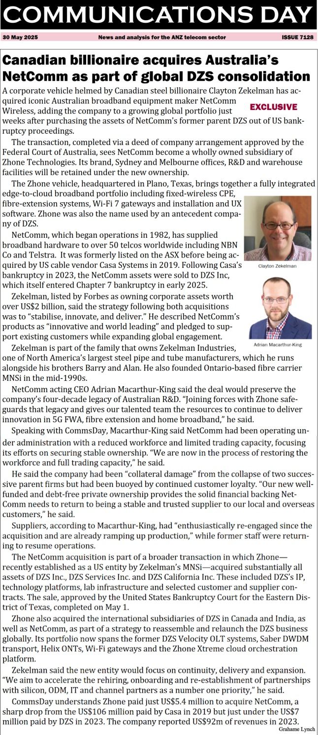 Communications Day reports on the acquisition of Australia's NetComm Wireless by Canadian billionaire as part of global DZS consolidation strategy.